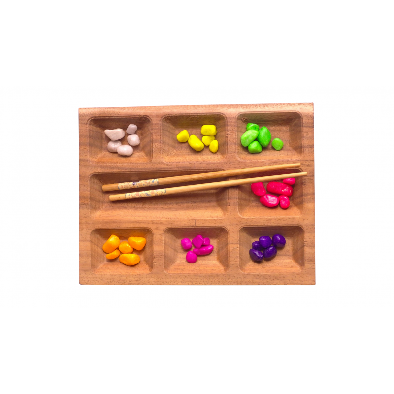 This Sensory Colour Sorter features a wooden board with color-coded slots, matching marbles, and two wooden sticks shaped like chopsticks. Children sort, match, and guide marbles into place—blending visual learning with tactile fun.